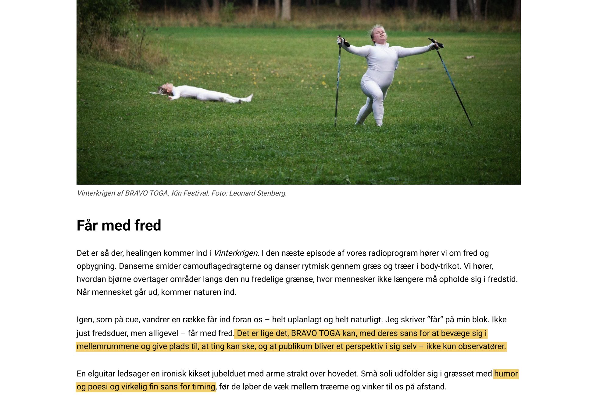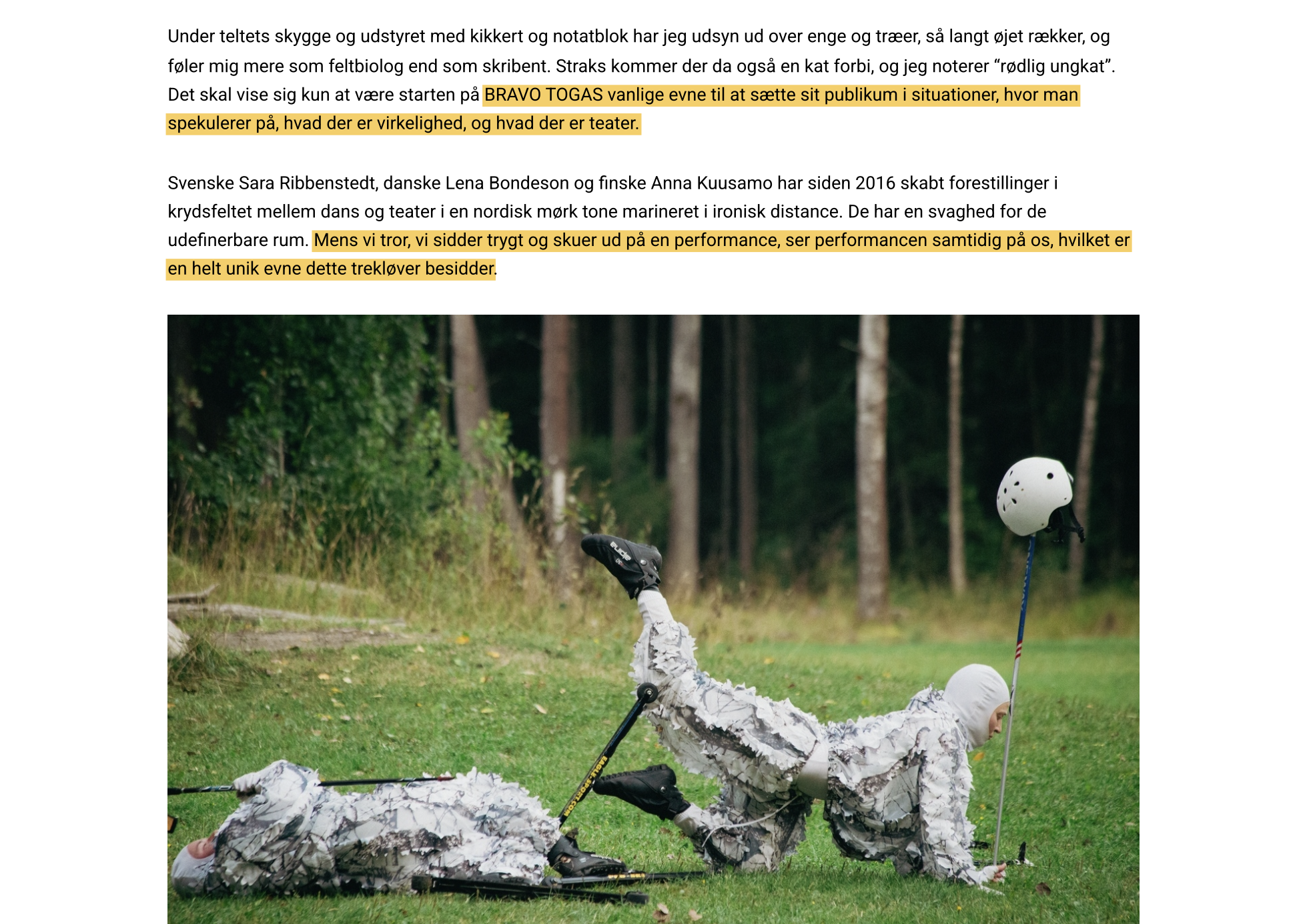 "Det er lige det, BRAVO TOGA kan, med deres sans for at bevæge sig i mellemrummene, og give plads til, at ting kan ske, og at publikum bliver et perspektiv i sig selv - ikke kun observatører"